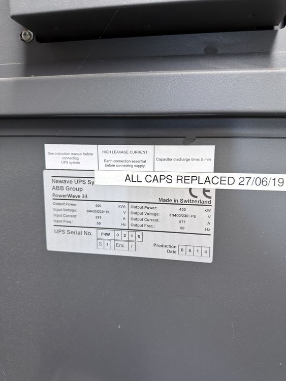 2014, capacity of UPS - 400 kVa, inclusions 100 batteries, serviced from new by Uninterruptable Power Supplies (a Kohler company), Two systems in stock