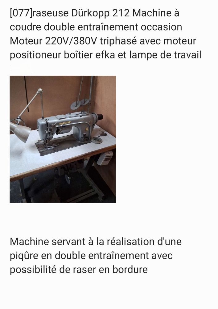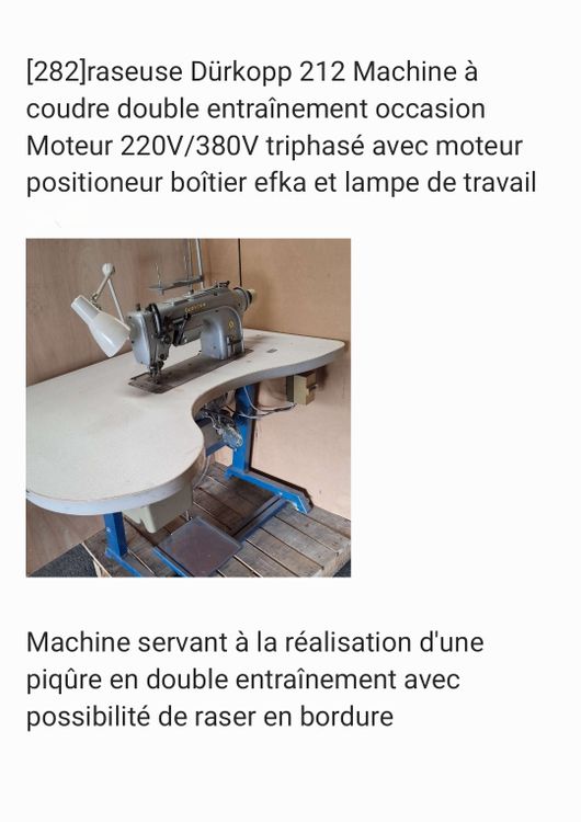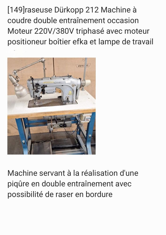 Lot de 5 machines a coudre raseuse double entrainement occasion, en état fonctionel, moteur 220V/380V triphasé avec moteur positioneur boitier efka et lampe de travail; Machine servant a la réalisation d'une piqure en double ebtrainement avec possibilité de raser en bordure.