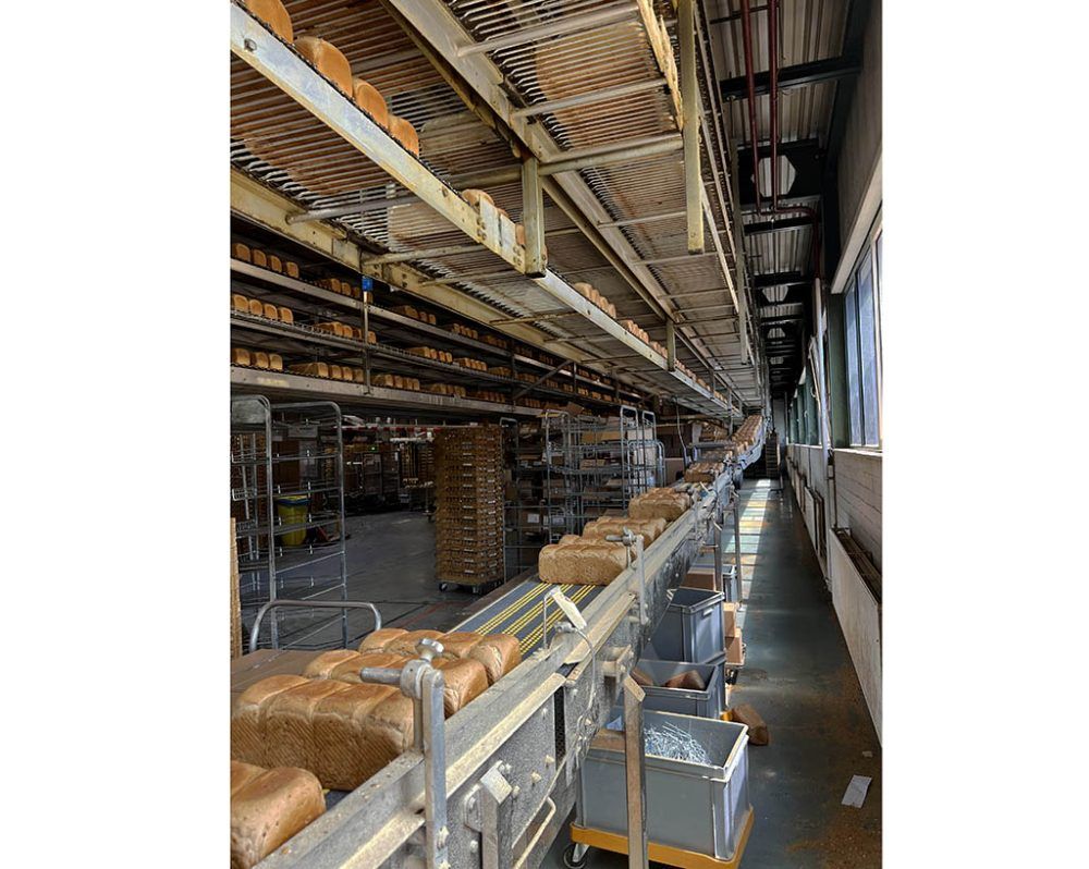 Capway product cooling conveyor system for large-loaf bread, from depanner to packaging line, 4 tiers, total length approx. 985m, incl. curves, switches, transfers, etc.;