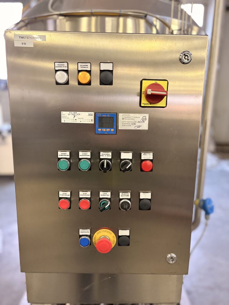 Stainless steel vessel equipped with a main agitator and a dedicated high-shear disperser, ideal for fast and uniform dispersion of ingredients. Heating jacket for process temperature control. Stainless steel control panel with digital temperature controller, heating/cooling selection, separate controls for agitator and disperser, agitation speed adjustment, and integrated safety devices. Machine mounted on a self-supporting frame.
