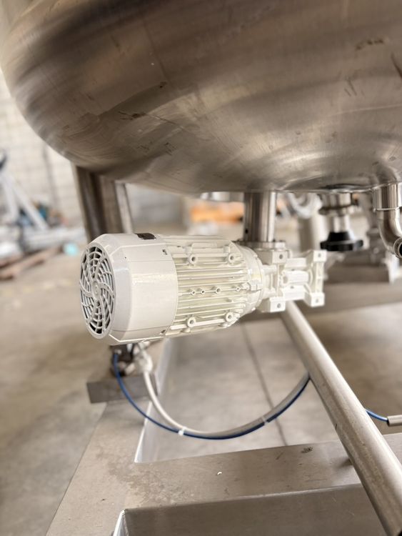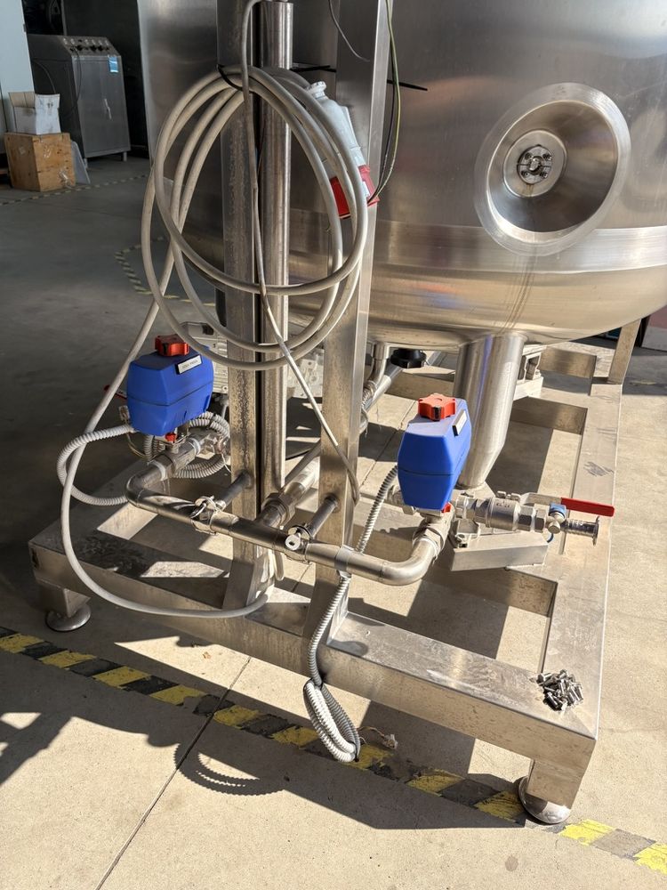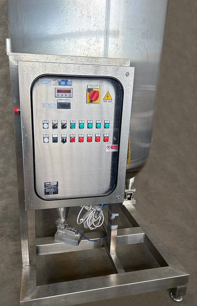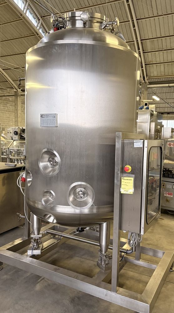 Vertical stainless steel vessel designed for the pharmaceutical sector, equipped with a magnetic drive agitator and an integrated weighing system via three load cells. The tank features an external heating/cooling jacket on dimple channels, AISI 304 stainless steel insulation, and certified safety accessories. The configuration includes a spray ball for CIP cycles and an inspection lamp with sight glass. Comprehensive of material certifications, installed instrument certifications, and PED certification. Main Chamber Capacity: 1,845 lt