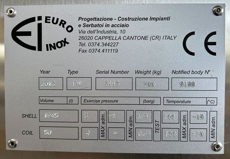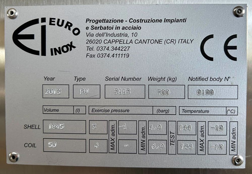 Maximum Allowable Pressure (PS) Chamber: 3 bar
