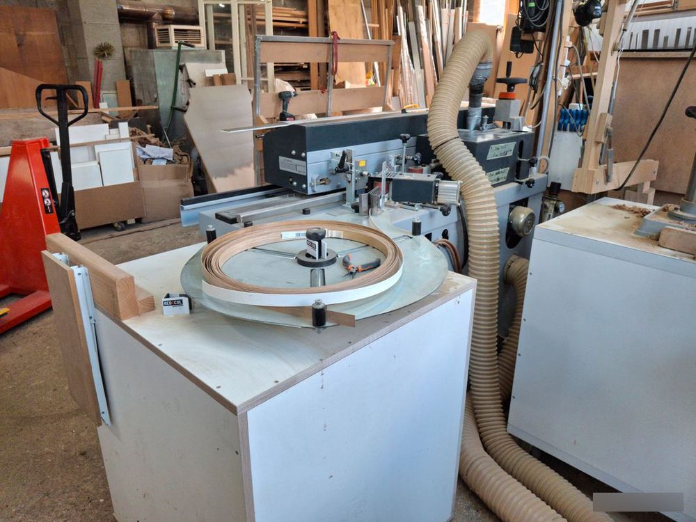 Sold with a bucket of glue, tools, a custom-made roller storage unit, various edge banding materials, and small accessories.