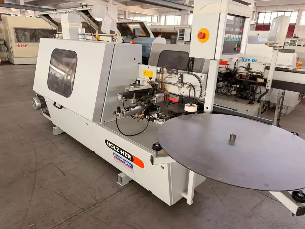 Automatic edge banding machine for wood, veneer, solid wood, PVC, and melamine edges.