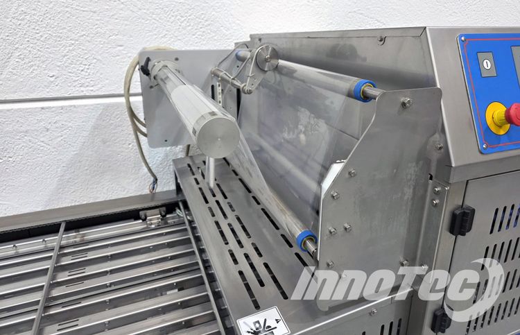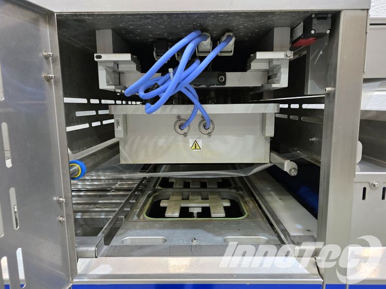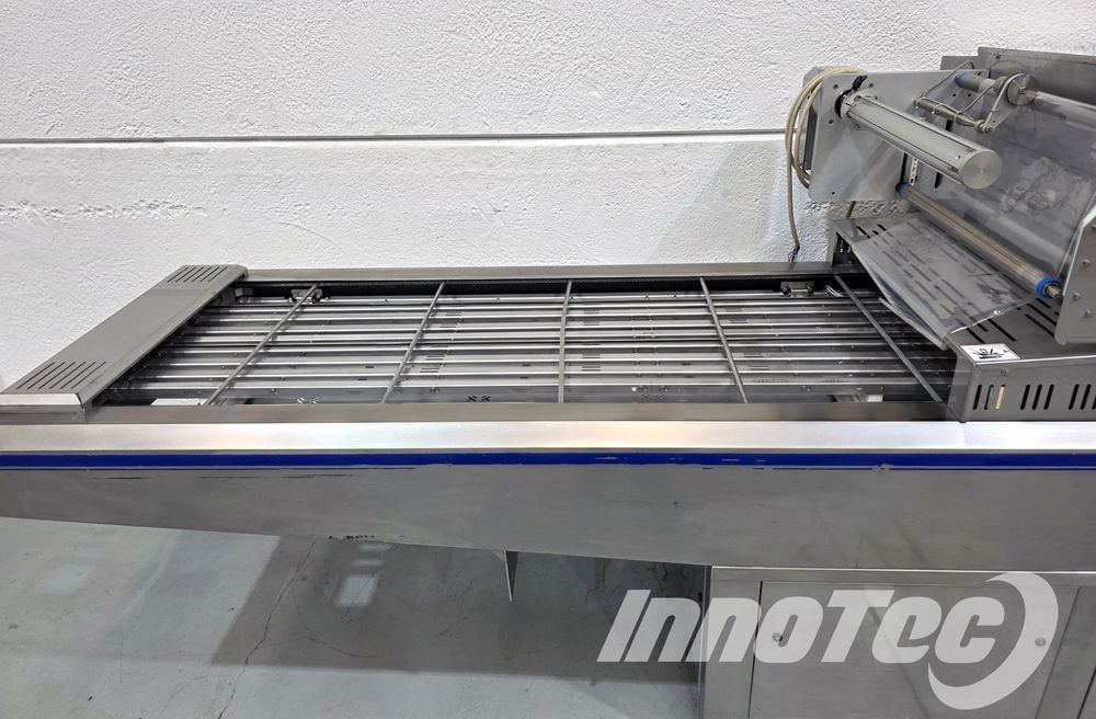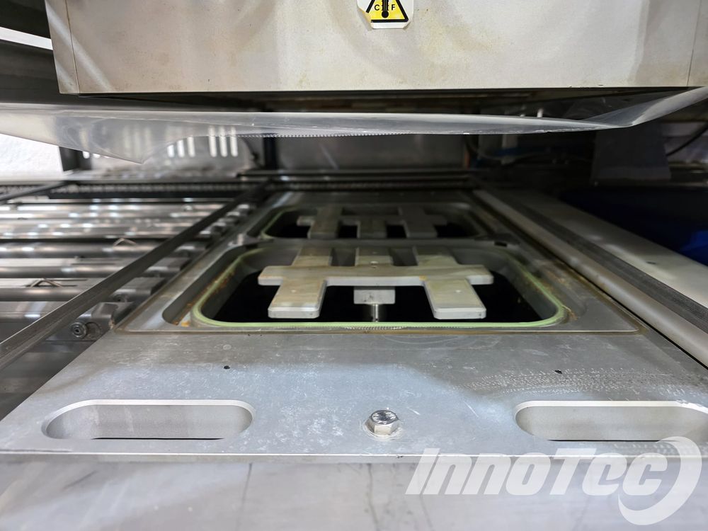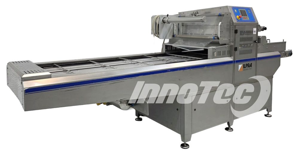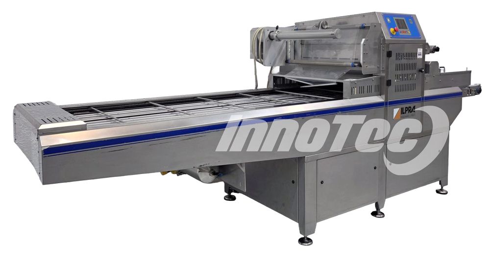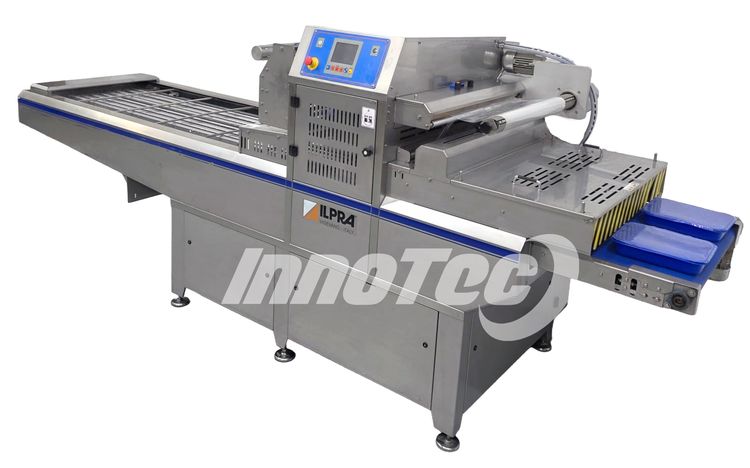 Termoselladora automática, para envases preformadas. Equipo de ocasión prácticamente nuevo. Del Fabricante ILPRA, Modelo FP SPEEDY 2 EMEC. Especialmente diseñada para Envasar en formato de termosellado para conseguir una mejor presentación, así como facilidad de almacenaje y transporte. Realiza automáticamente el termosellado, recorte perfecto del filme y recogido automático del film. Dispone de 1 horma de sellado. Horma para sellado de 2 envases a la vez. Incluye alineador de bandejas en la cinta de salida.
