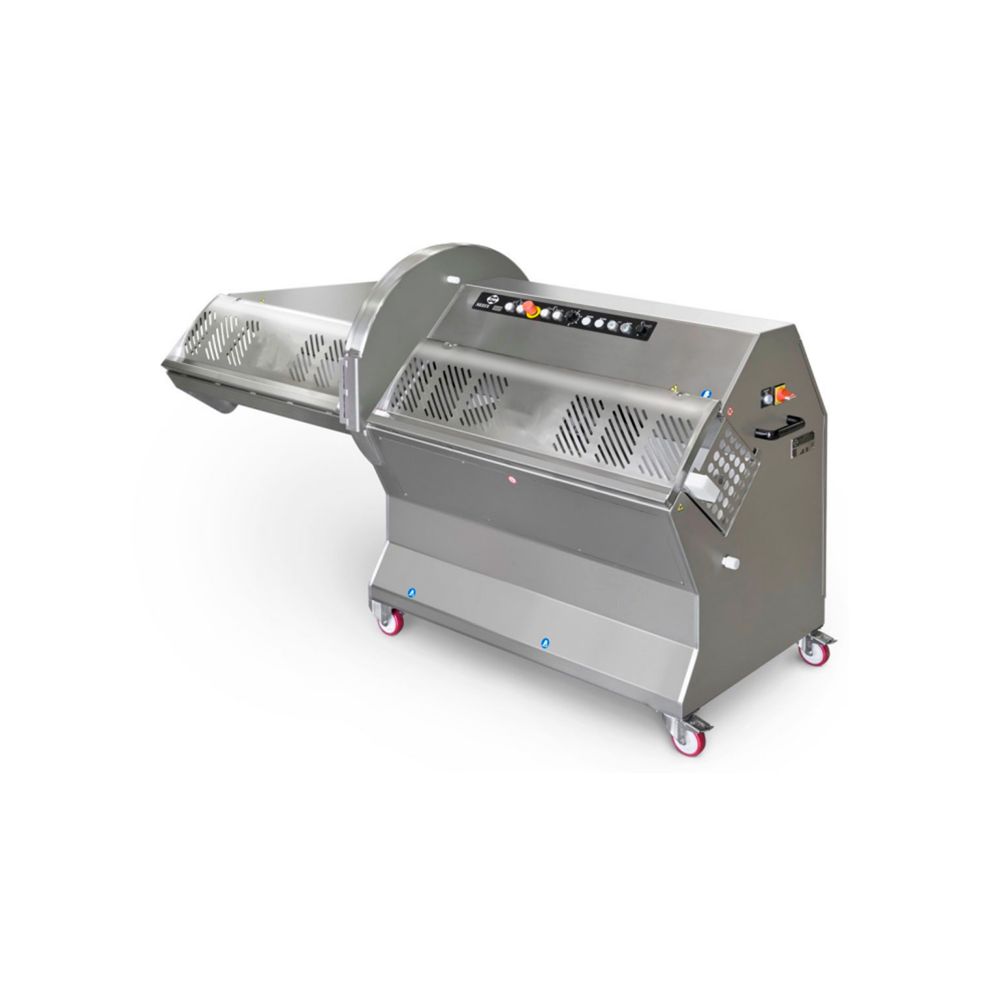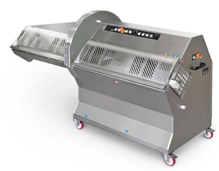Higiene: Característica única La máquina se puede abrir completamente para inspeccionar y limpiar el área de la cuchilla de 360°, incluyendo los bordes de corte horizontales y verticales. Se puede limpiar con equipos de alta presión.