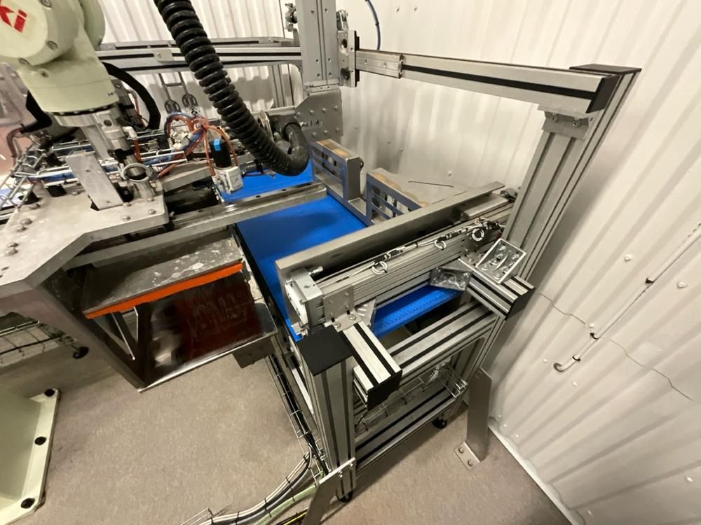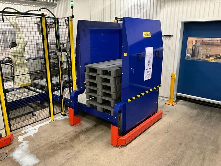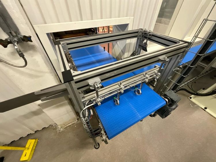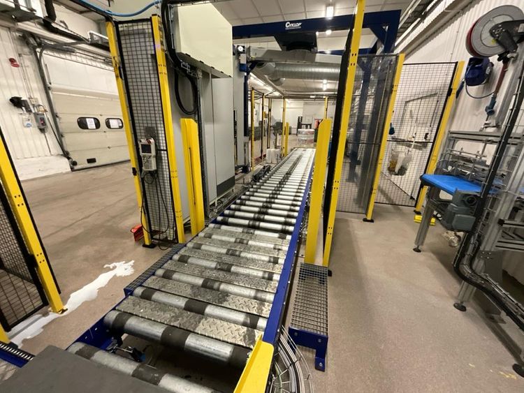 Consisting out of: feeding conveyor 600mm, positioning conveyor 520mm, Kawasaki stacking robot, pallet feeder, roller track 900mm, Cyklop pallet wrapper, intermec lable printer, control cabinet