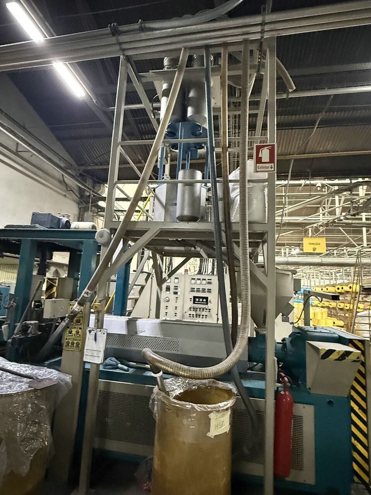 Ø75 mm extruder, gravimetric dosing system for 4 components, mesh filter changer, monofilament die nozzle, quenching water bath,
