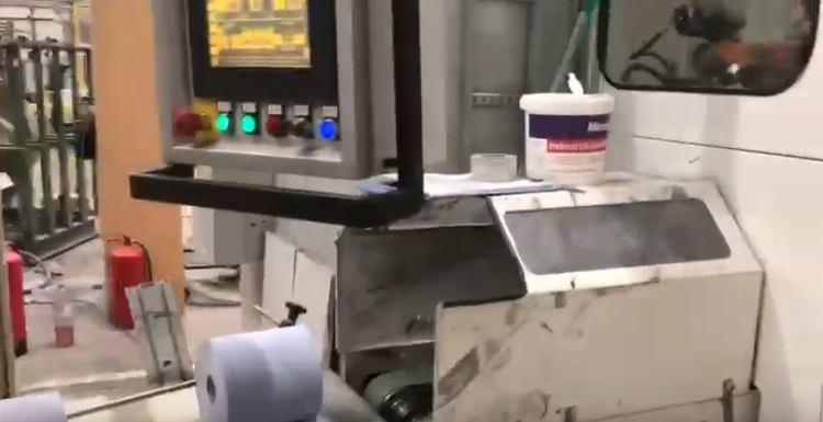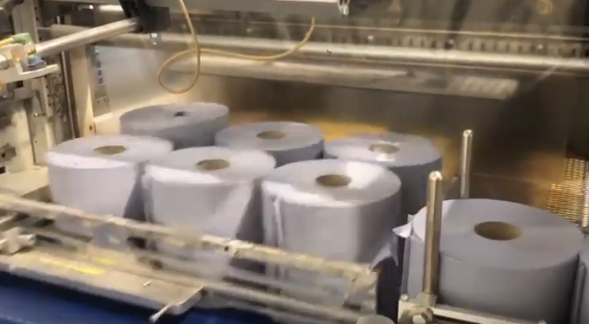 Fast AUTOMATIC industrial start stop rewinder year 2018 with PCMC log saw, and Adpack wrapper, 400 m/ mn
