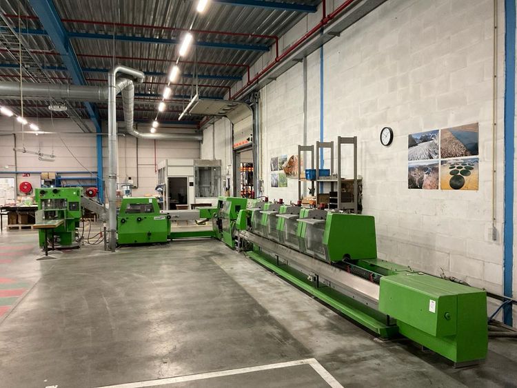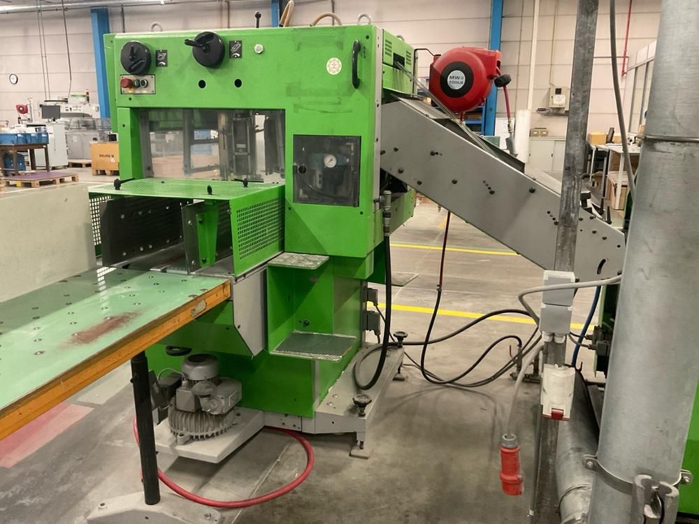 min/max sheet format 170 x200/520 x 310 mm, with 4 horizontal folder feeders model 370.0400 serial number 91.01235, 1528 cover feeder, serial number 91.01235.01, 390 stitching unit with 2 stitchers , 3 knife trimmer model 0360. 0400, serial number 91. 01235, transfer transport, 5, inclined belt transfer, sheet stacker, model 310-CS-14, serial number 97.00942, outlet roller feeder, 2-door main power cabinet, serial number 91.01235, 220/380V, 50 Hz, 50A 2 Elmo Rietschle various vacuum pumps, wire stands, total machine L-shape length approx. 15 meter, etc.