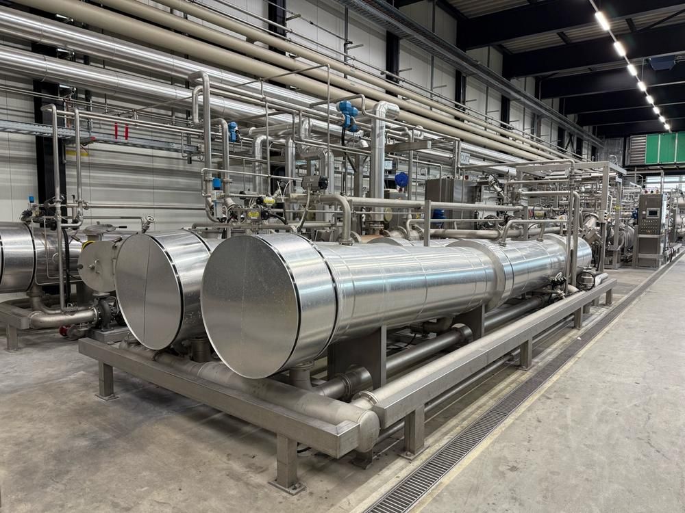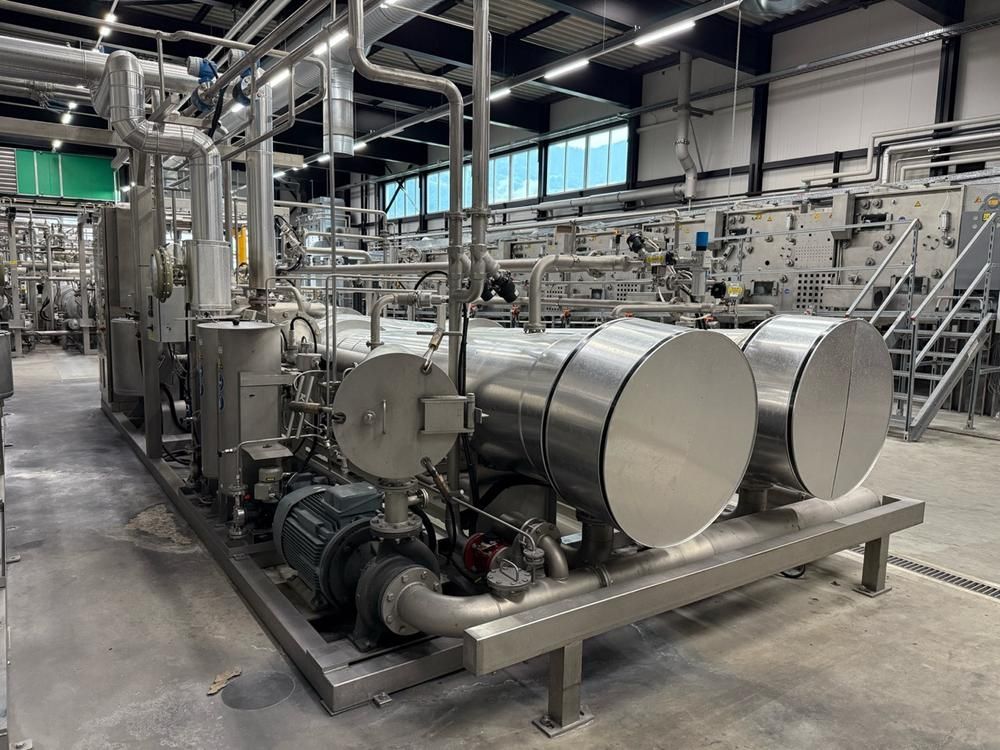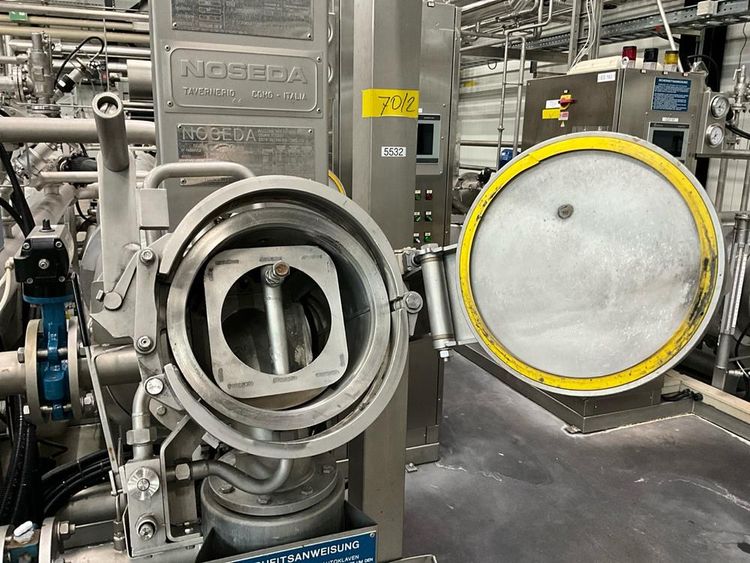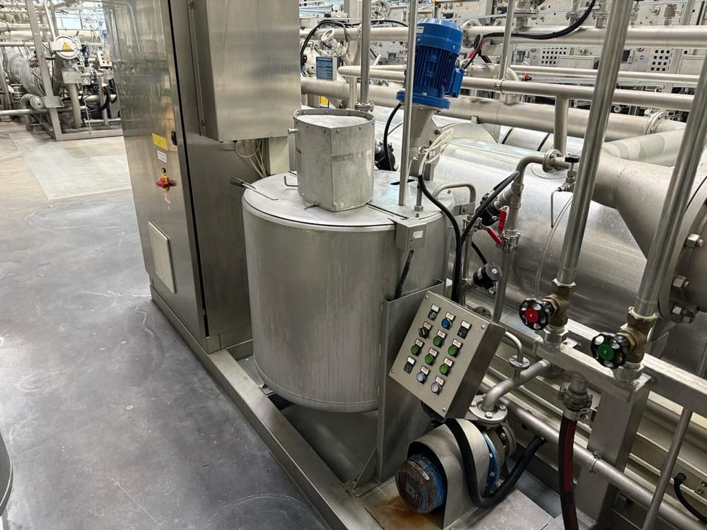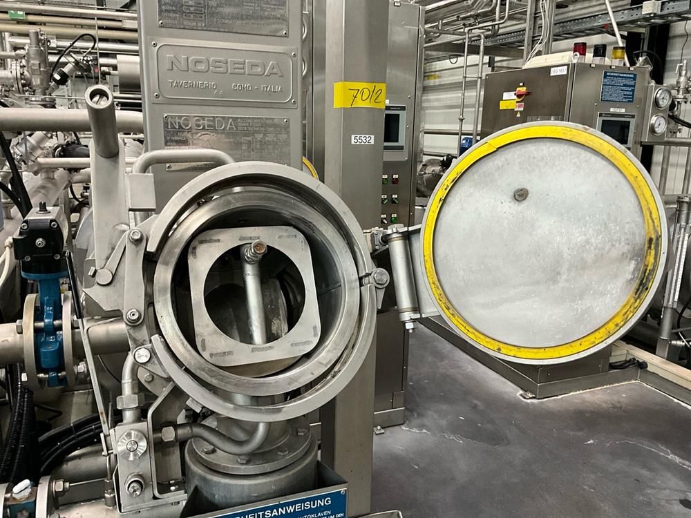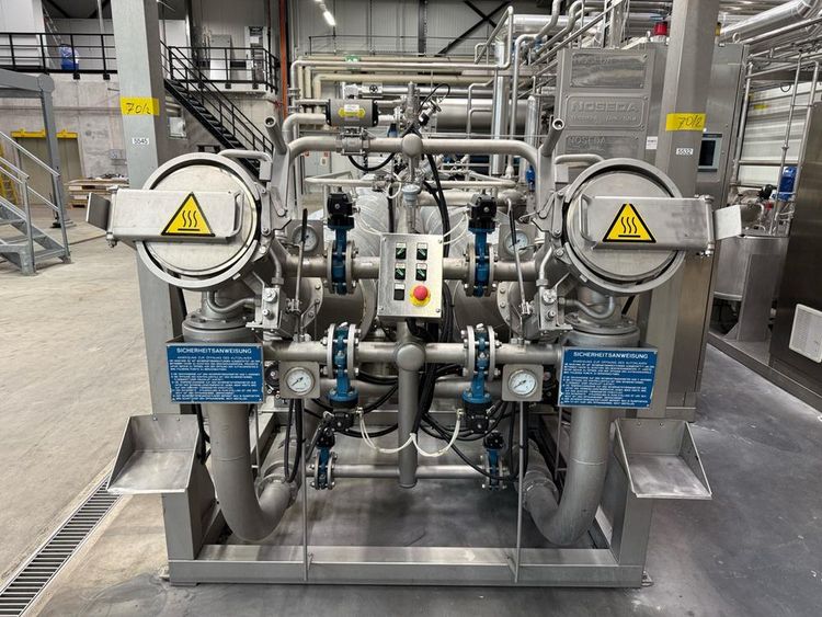 volume approx. 2200/4400 liter, 5-7,6 bar, design temp 143/170 degrees, with central main control touch screen SedoThreepoint, Sedomat 8010, open vessel diam. 750 x 650 mm with mixer, 2 open small tanks diam. 320 x 1000 mm with pumps, horizontal B+F module 7-20 bar, 143 degrees, pneumatic valves, ABB control type AX 400, Becatron control box with smart card, dimensions approx. 11000 x 3200 x 3000 mm, on stainless steel frame, valves a.o. Automax, combined piping, full isolated, in-feed top reels, on stainless bed frames, CUT02, included 9 various stainless steel form sets, (included rack) reference number #10672