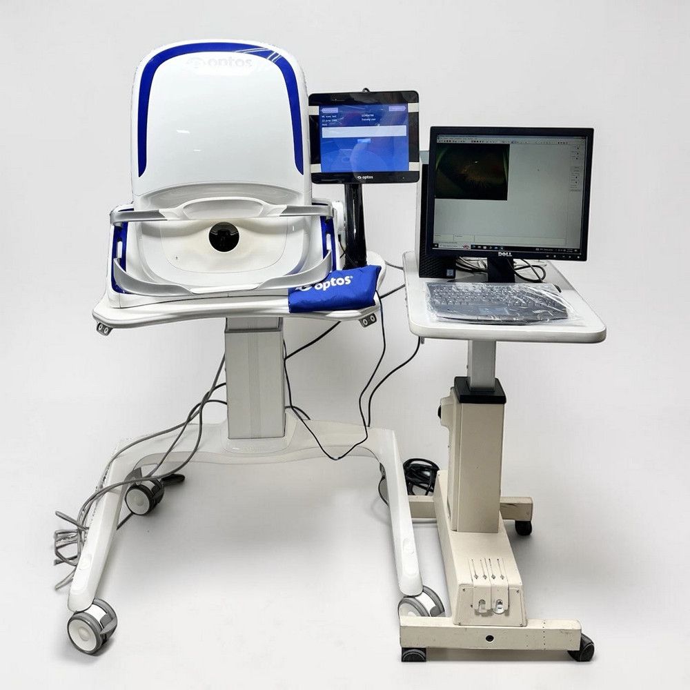 The Optos California P200DT is Optos’s flagship ultra-widefield retinal imaging system, capturing 200° of the retina in a single non-contact image — without montage, without lens, without dilation for most patients. This used unit includes the fluorescein angiography (FA) module, enabling dynamic peripheral vascular assessment that traditional fundus cameras can’t reach. At $38,500, it delivers Optos-level widefield coverage at significantly below new-equipment pricing.