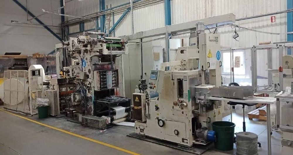 Tissue napkins line with printer + Mechanical Folding Unit (year 2000) + Napkin Automatic Wrapping Machine (year 1999)