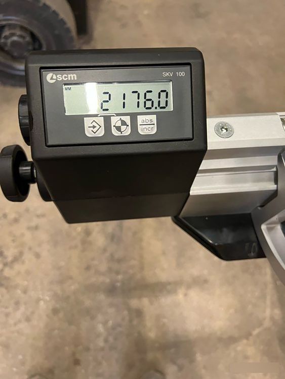Digital 3-axis sliding table saw with overhead control panel and end-of-carriage start.