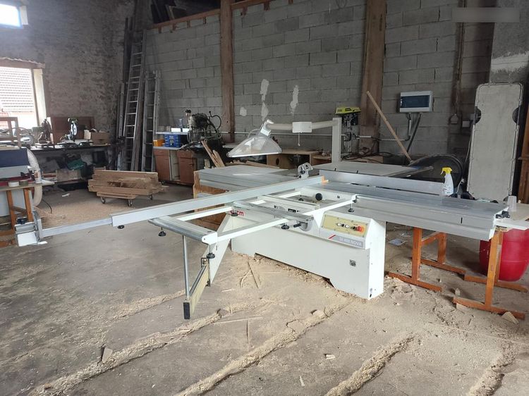 Professional panel saw suitable for serial production, cutting solid or engineered wood panels.