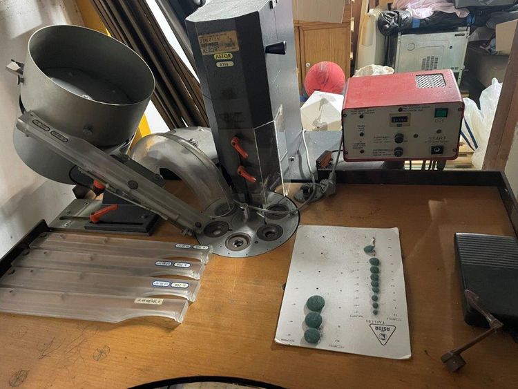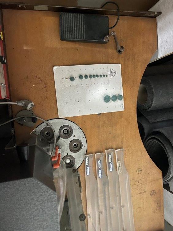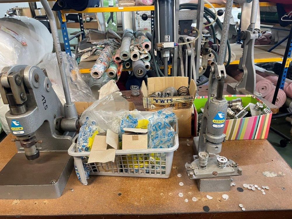 With the manual machines for cutting the fabric circles (one pneumatic and one lever-arm), and also a manual button-making machine.
