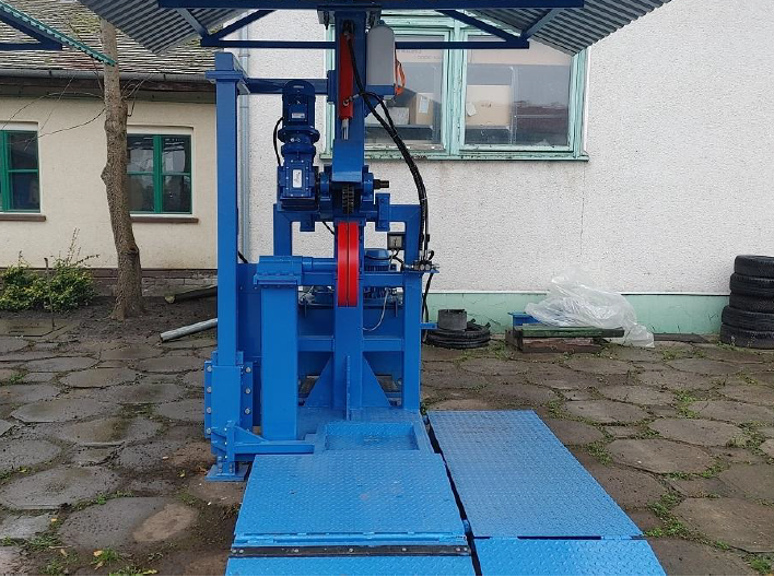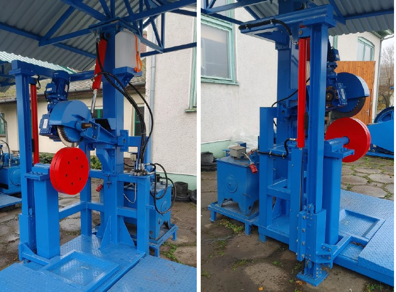 The machine is equipped with a rotary knife cutting system and a hydraulic lifting mechanism.