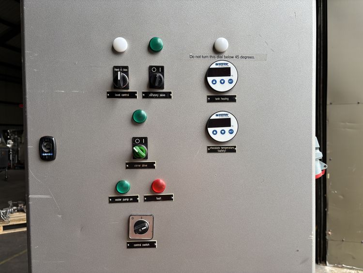 2006, chocolate tank, 100Kgs capacity with adjustable temperature control, top mounted motor with agitation and scrape surface, 3Ph