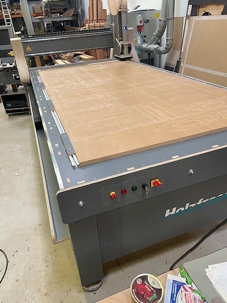 Milling bed in 19 mm MDF as a sacrificial plate.
