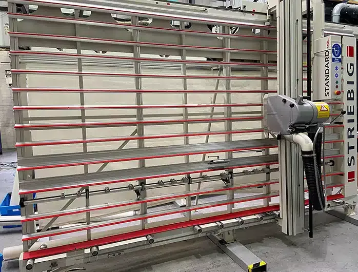 Features automatically moving rear frame, full length mid-height material supports, panel transport rollers