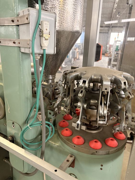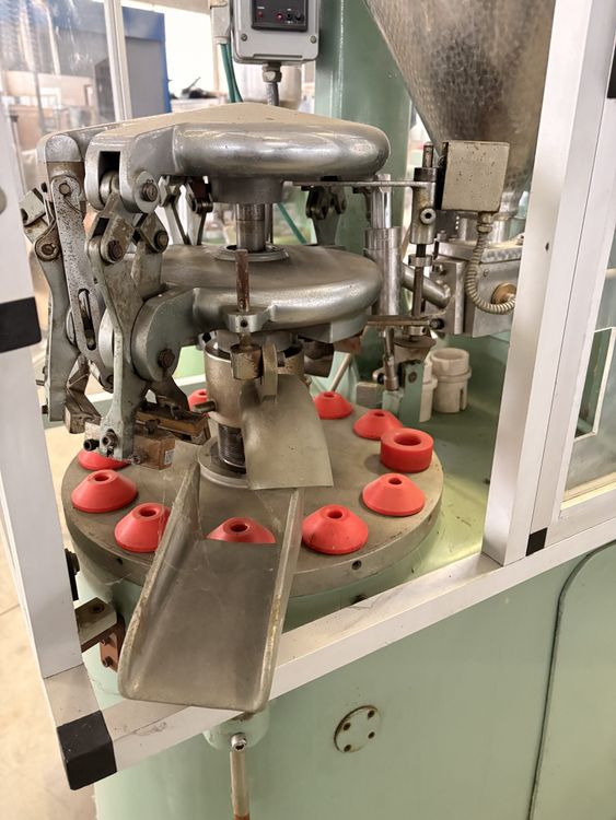 Semi-automatic rotary-table tube filling machine for aluminium tubes, with manual tube loading, controlled volumetric dosing and mechanical crimping closure. Rotary table with dedicated seats for manual positioning of aluminium tubes by the operator. Filling station equipped with adjustable volumetric dosing pump. Mechanical crimping closure of the aluminium tube rim. Rotary table with 12 stations